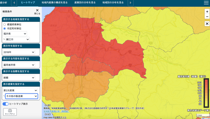 メガネの街であり、それらが他産業と比べて、比較的に多く所得を生み出す傾向にあると考えられる。(周辺地域と比べても大きく所得を生み出せている傾向になる。)